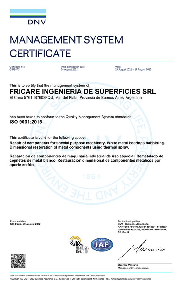 Obtuvimos la Certificación ISO 9001:2015 para la "Reparación de componentes de maquinaria industrial de uso especial. Remetalado de cojinetes de metal blanco. Restauración dimensional de componentes metálicos por aporte en frío."